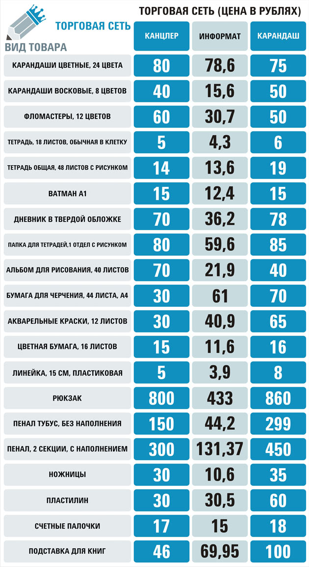 Проект «Ценовая разница» подходит к концу, напоследок расскажем вам, где выгоднее собрать ребенка в школу. Лето заканчивается, и отдохнувшие горожане уже вовсю готовятся к новому учебному году. Что нужно современному школьнику для полноценного учебного процесса? Список выйдет внушительный и у первоклашки, и у выпускника. Наверняка, дороже всего для родительского кошелька обойдется школьная форма, спортивные костюмы и обувь. Учебники в большинстве школ предоставляются бесплатно, а вот рабочие тетради для младших классов стоят немало. Придется потратиться и на рюкзак или сумку для девочек. Канцелярские товары, если рассматривать по отдельности, стоят немного. Например, стоимость шариковой ручки начинается от 3-х рублей, тетрадей от 5, но если наполнить ранец всем необходимым – выйдет внушительная сумма. Если раньше перед школой закупались традиционно в «Детском мире», то сейчас широкий выбор канцелярии можно найти даже в продуктовых супермаркетах. Также не стоит забывать и о школьных ярмарках, считается, что цены там ниже. Ну а мы представили, что собираем набор первоклассника в одной из сетей канцтоваров. В Архангельске их, конечно, очень много, мы для примера посетили три магазина. Итак, предлагаем вам ознакомиться с ценами на карандаши и пластилин в магазинах города.